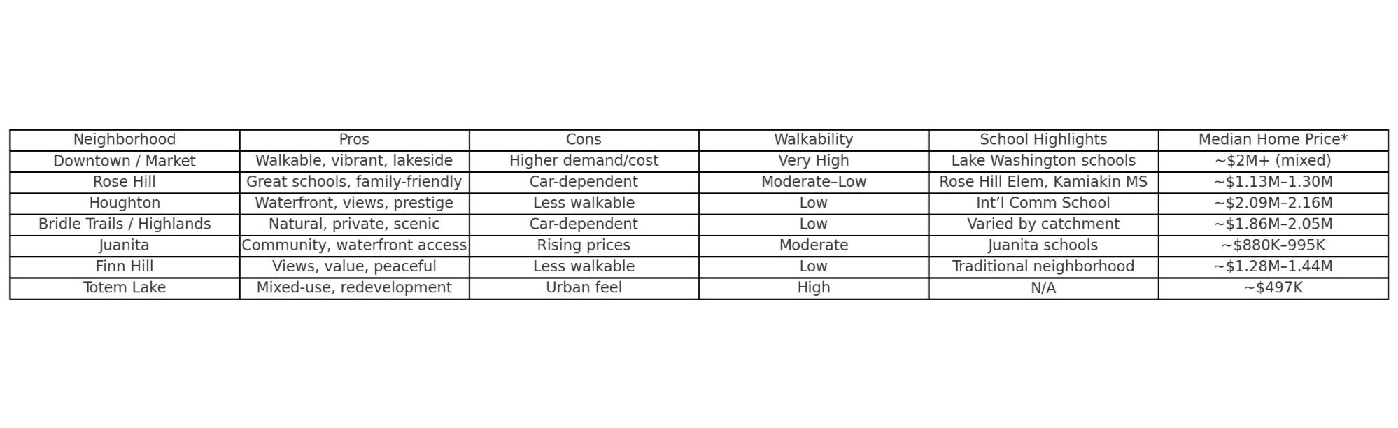 Families may gravitate toward Rose Hill, Houghton, or Finn Hill for schools and community feel.